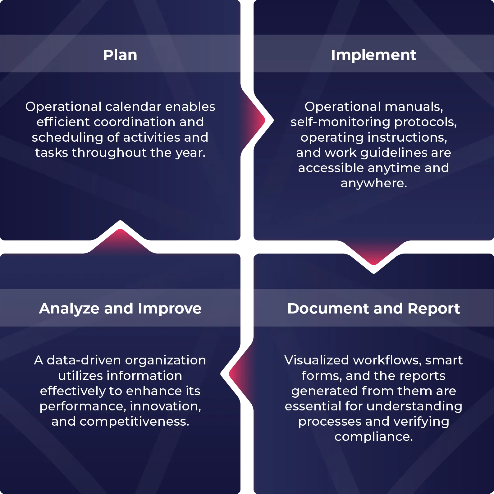 The use of Umbrella HSQE Solution is based on the PDCA model, where operations are developed as a continuous, competitive-strengthening cycle of planning, implementation, checking, and adjustment.